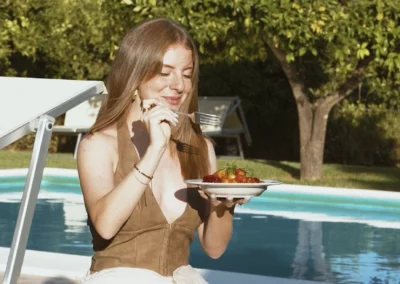 Situata in una posizione appartata rispetto agli alloggi, la piscina è immersa tra rigogliosi alberi di arancio, creando un’oasi di pace e frescura. Tutto intorno si estende un ampio solarium, sempre soleggiato, attrezzato con salotti, sdraio, ombrelloni e tavolini, perfetti per sorseggiare i freschi e originali drink preparati dal bar.