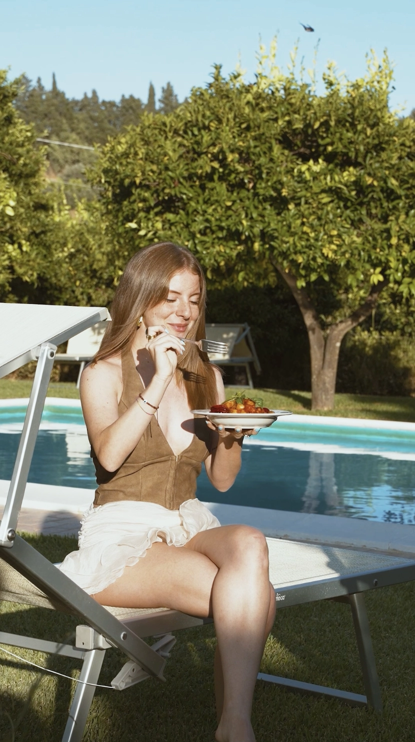 La piscina, con una vasca di 72 mq, è pensata per il massimo comfort. Accanto, la doccia immersa nel profumo di gelsomino rilascia acqua calda, riscaldata in modo sostenibile grazie all’energia solare.
